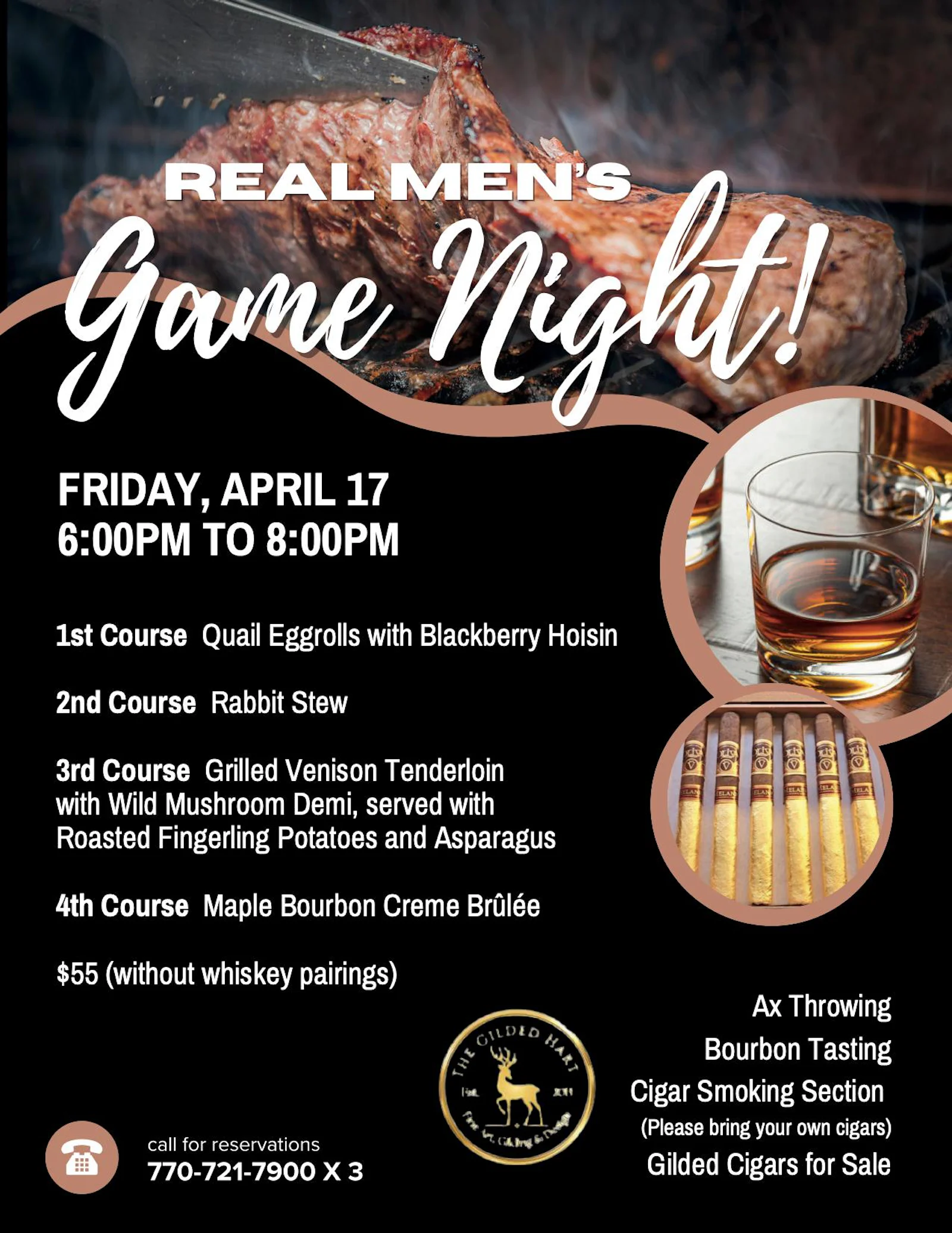 In addition to Ax Throwing, Bourbon Tasting, and a Cigar Smoking Section, you can indulge in a 4 course meal of quail, rabbit, and venison.